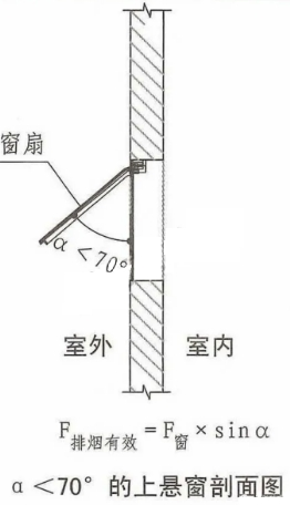 當(dāng)選用開窗角大于70°的懸窗時,其面積應(yīng)按窗的面積核算:排煙有用面積=可敞開窗的面積