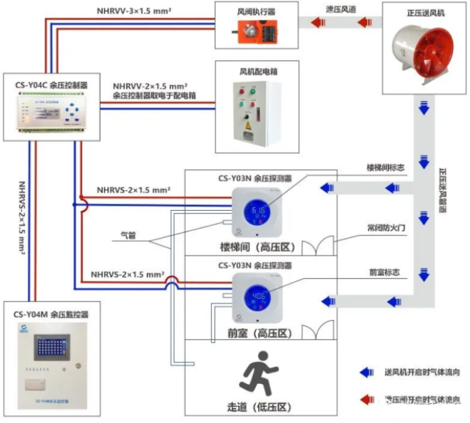 3、余壓控制器由風(fēng)機配電箱供電,擔(dān)任給余壓探測器和泄壓閥執(zhí)行器供電。