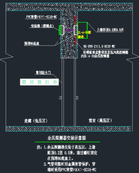 余壓探測(cè)器:也叫壓差控制器、余壓探測(cè)器、壓力傳感器等,如圖,壁掛安裝樓梯間、前室內(nèi)防火門(mén)那一側(cè)(上圖右上部分),氣流穩(wěn)定避開(kāi)風(fēng)口的地方,距頂20~50公分,直接固定在預(yù)埋86盒上壁掛安裝。