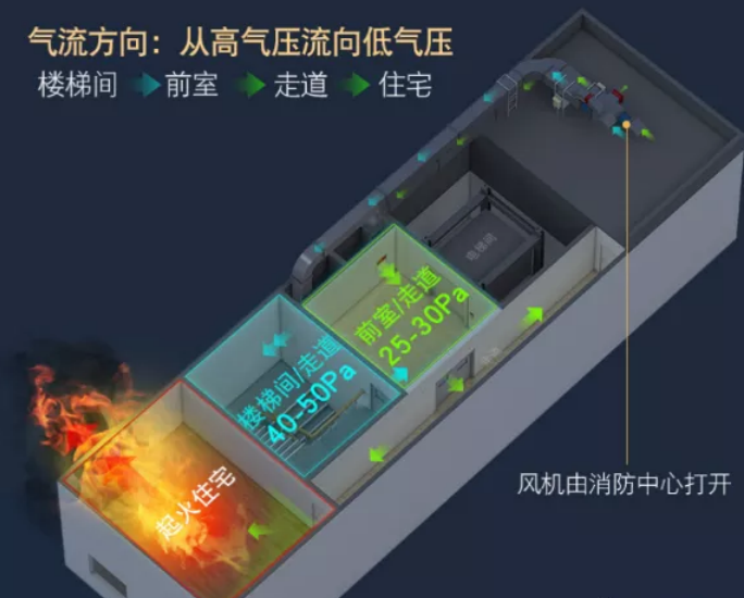 加壓送風(fēng)作為一種行之有效的防煙方式,在國內(nèi)外高層修建規(guī)劃中已被廣泛接受與選用。無論國內(nèi)或國外的防火標準,都有一致的加壓要求,即應(yīng)使在火災(zāi)時,樓梯間余壓值(40-50Pa)>前室余壓值(25-30Pa)>走廊。