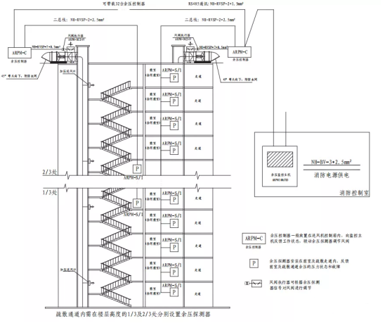 2)樓梯間在約1/4和3/4高度處各設置一臺余壓探測器;