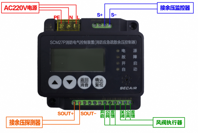 將連接余壓探測器的無極性二總線接入27P的"SOUT+"、"SOUT-"端;