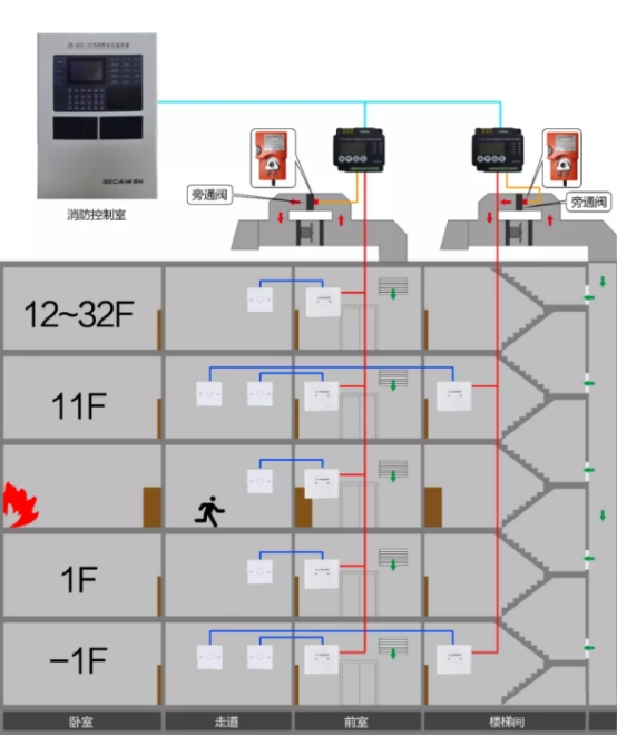 其中,余壓監(jiān)控器裝置在消控室內(nèi),余壓探測器裝置在電梯前室和樓梯走道,余壓控制器和風(fēng)閥控制器裝置在風(fēng)機(jī)控制柜。