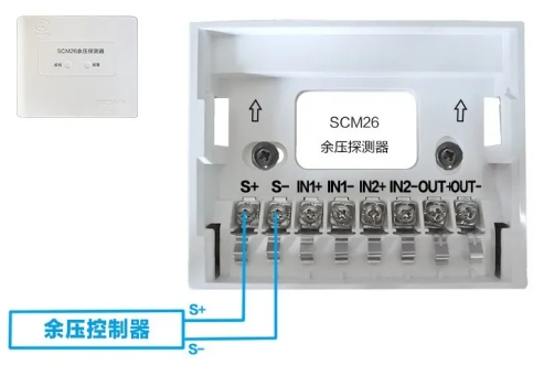 將"S+"、"S-"經(jīng)過無極性二總線接入到余壓監(jiān)控器。