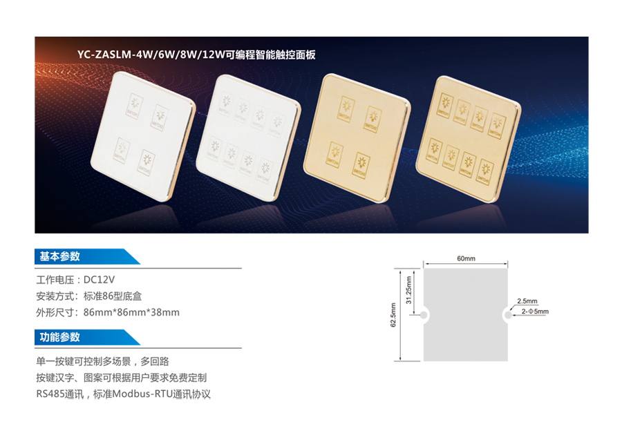 單一按鍵可控制多場景,多回路;按鍵漢字、圖案可根據(jù)用戶要求免費(fèi)定制;RS485通訊、標(biāo)準(zhǔn)Modbus-RTU通訊協(xié)議