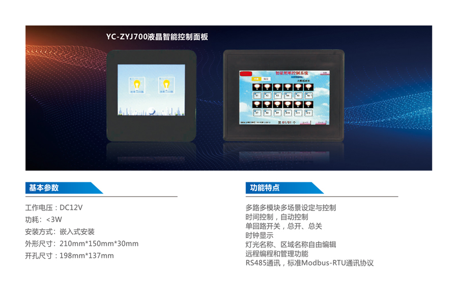 工作電壓:DC12V;功耗:<3W;安裝方式:嵌入式安裝;外形尺寸:210mm*150mm*30mm;開(kāi)孔尺寸:198mm*137mm
